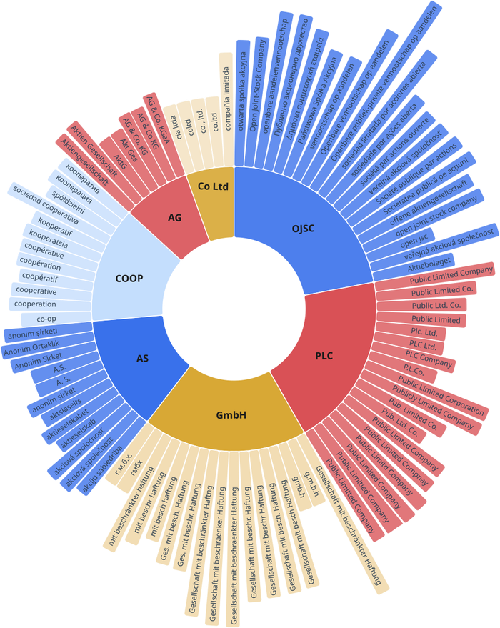 - We make open data and infrastructure. We’ve been creating valuable structured reference data for name matching. In this list of organizational suffixes, we track common legal forms (e.g., S.A., Ltd, GmbH) and their variants across languages. Another resource on symbolic representations captures multilingual equivalencies and formatting quirks for common name components like “Holding”, “Management” and so on. Check out this overview of the data assets we've published.