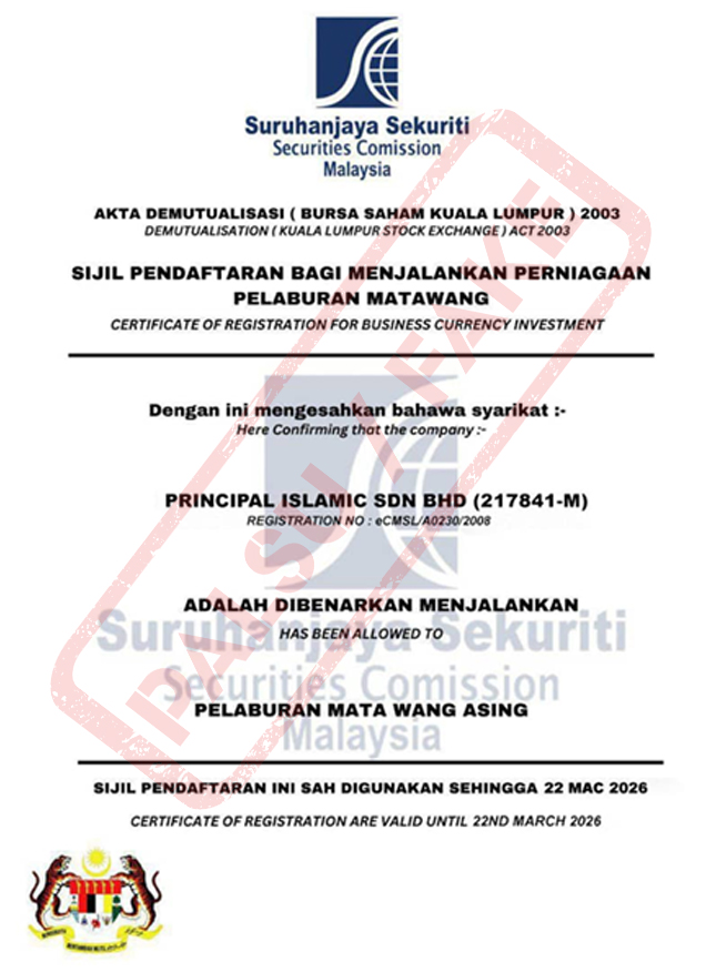 • Misusing the name and credentials of Principal Islamic Asset Management Sdn Bhd (eCMSL/A0230/2008) a licensed entity with SC for fund management (fund management in relation to portfolio management) investment advice to carry out an illegal investment scheme
