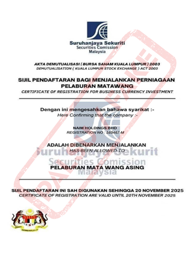 • Misusing the name and credentials of Naim Holdings Berhad (a company listed on Bursa Malaysia) to carry out an illegal investment scheme offering high returns e.g. return of RM11,154 in 3 hours with investment of RM300