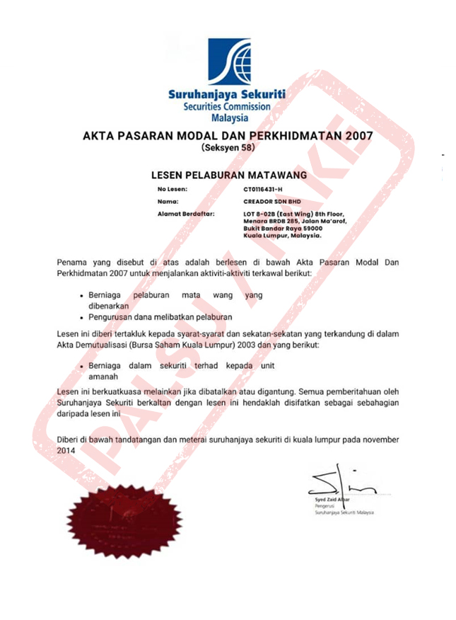 · Misusing the name and credentials of Creador Sdn Bhd (VCPE/0011/2022) a registered entity with SC for Venture Capital / Private Equity (Private Equity Management Corporation) to carry out an illegal investment scheme