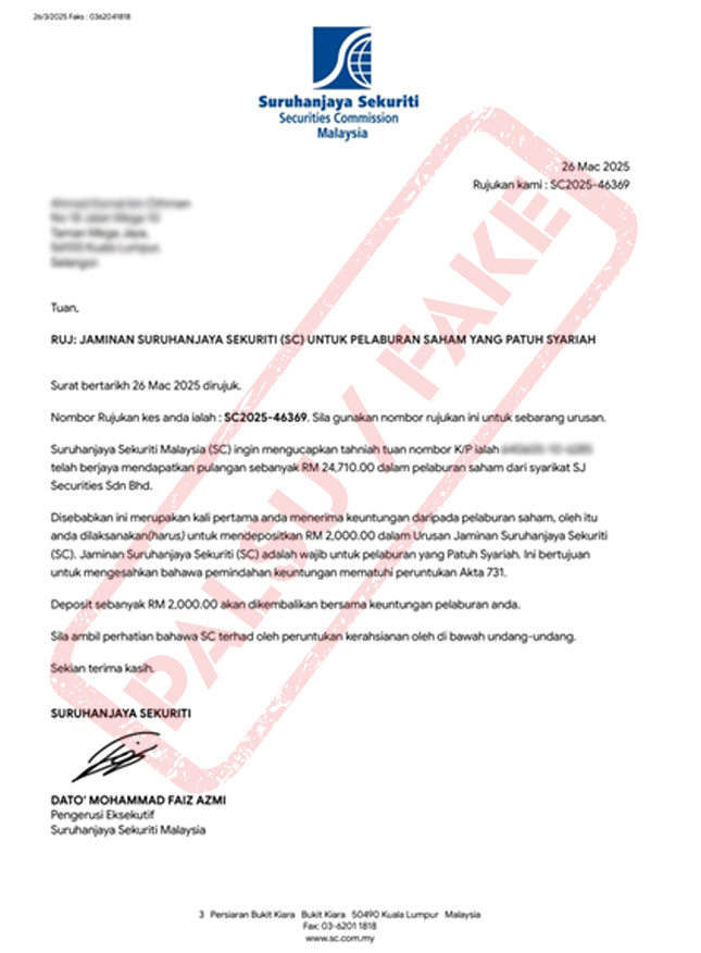 • Misusing the name and credentials of SJ Securities Sdn Bhd (eCMSL/A0016/2007) a licensed entity with SC for dealing in securities and advising on corporate finance to carry out an illegal investment scheme